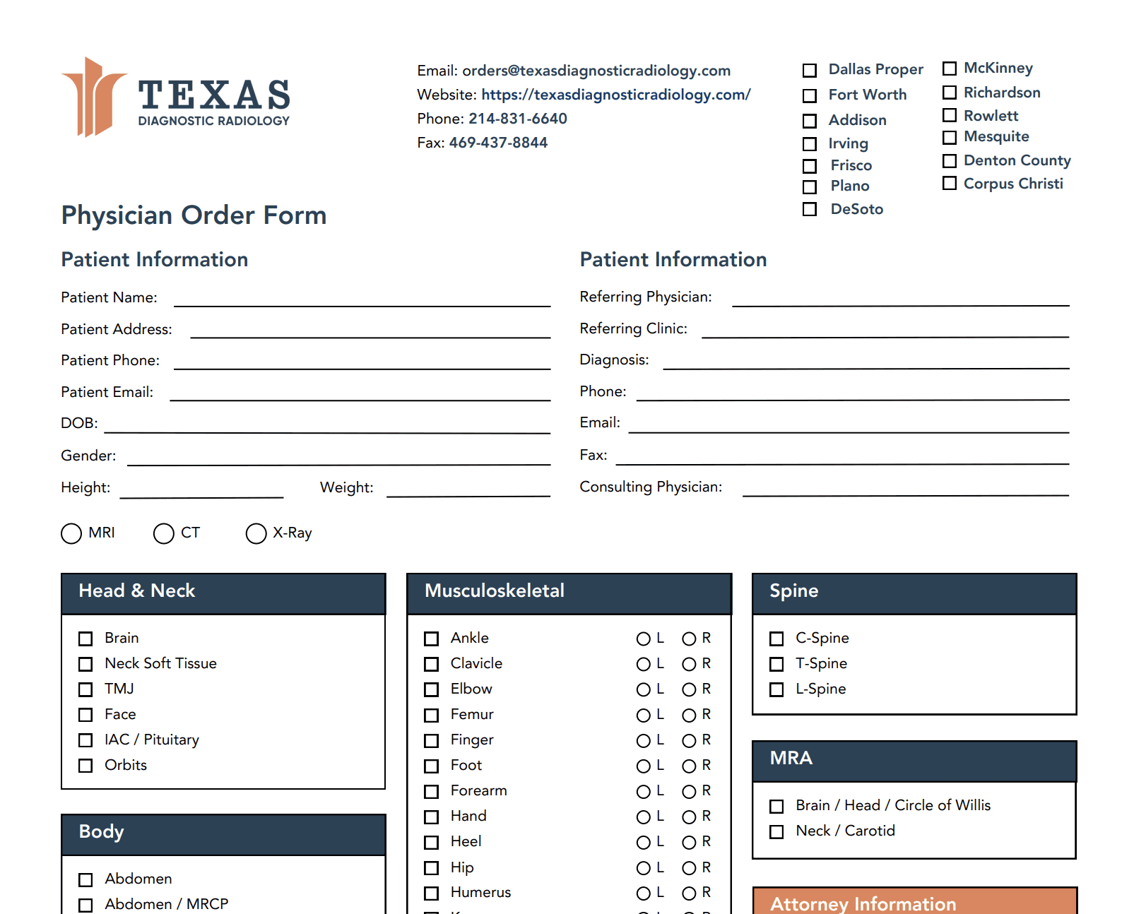 Fill out this form to send us an imaging order in the Dallas Fort Worth area.